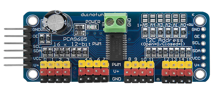Additionally, the output frequency of all 16 channels can be programmed from 24Hz to 1526Hz. Intended for controlling the brightness of multiple LEDs, the programmability of its PWM outputs means that it can also be configured for producing PWM signals compatible with driving standard servos. This module has been designed with this purpose in mind with 16 sets of headers that allow for any servo with a standard header to be directly plugged into the module. A screw terminal block provides a means of powering the attached servos from an external 5V PSU and so the number of servos you can drive from your microcontroller and so is not limited by the microcontrollerās power supply. For Arduino users, with this module and our exclusive Arduino library (HCPCA9685) you can directly control up to 16 servos from your Arduino with only a few commands.